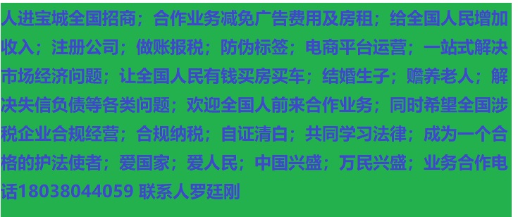 人進(jìn)寶城全國招商;合作業(yè)務(wù)減免廣告費用;歡迎全國涉稅企業(yè)前來合作;業(yè)務(wù)合作電話 18038044059 聯(lián)系人羅廷剛